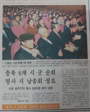 [동양일보 김미나 기자]시(詩)를 사랑하는 신문, 동양일보는 대한민국 일간 신문 사상 최초로 1995년부터 하루도 빠짐없이 지면을 통해 시를 소개하고 있으며, 창간 이후 줄곧 시낭송과 관련된 다양한 행사들을 개최해 왔다. ‘시낭송의 밤’ 행사를 시작으로 ‘명사시낭송회’, 포석조명희문학제 기념 ‘전국시낭송경연대회’, ‘충청북도시낭송경연대회’, '아이러브포엠' 등 우리 일상 속 시를 가까이하려는 여러 행사를 열고 있다. 동양일보 시 문화 행사의 지난 시간들을 지면을 통해 만나본다. ●각계 인사들이 전하는 따뜻한 시심, 명사시낭송회 명사