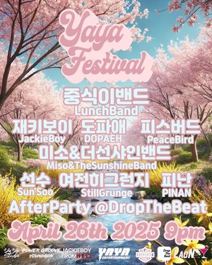 다음달 26일 오후 9시 청주시 충북대학교 중문에서 ‘야야 페스티벌’이 열린다. 이번 페스티벌은 ‘로드킹’, ‘라온’에서 동시 진행되며, 다양한 아티스트들이 무대에 오를 예정이다. 공연이 끝난 후 ‘드랍더비트’에서 애프터파티도 열린다.참여 아티스트로는 중식이밴드, 여전히그런지, 재키보이, 도파에, 피스버드, 미소&더선샤인밴드, 선수 그리고 피난 등이 있다.메인 스테이지는 최근 황가람의 리메이크로 큰 인기를 끌고 있는 '나는 반딧불'의 원곡자 중식이밴드가 장식할 예정이다.관계자는 “야야페스티벌을 통해 더 많은 시민들이 라이브 공연의