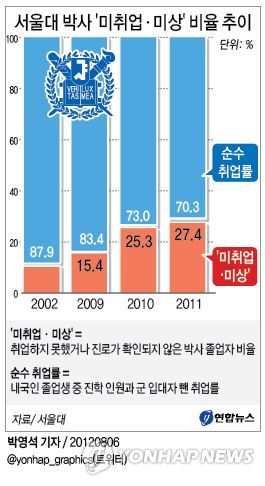 6일 서울대 2011년 통계연보의 ''졸업생 취업ㆍ진학 현황''에 따르면 지난해 기준으로 취업하지 못했거나 조사 과정에서 진로가 확인되지 않은 ''미취업ㆍ미상'' 항목으로 집계된 박사 졸업자 비율은 27.4%에 달했다.