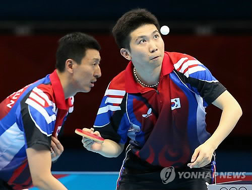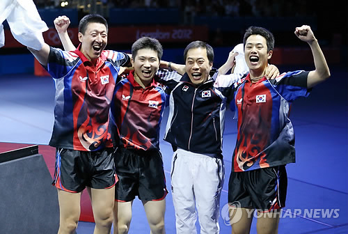 한국 남자 탁구가 2012 런던올림픽 단체전에서 홍콩을 누르고 결승에 올라 은메달을 확보했다.
