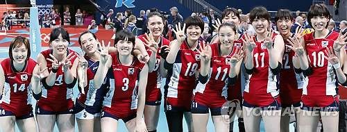 한국 여자 배구 선수들이 7일(현지시각) 영국 런던의 얼스코트에서 열린 2012년 런던올림픽 배구 8강전