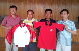 8일 FC서울 프로축구단 사장을 대신해 유원종(왼쪽 두번째) 월드비전 제천FC 총감독이 점퍼, 티셔츠 등 축구용품을 박정희(왼쪽 첫번째) 월드비전 제천FC 감독에게 전달하고 있다.