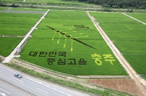 충주시가 2013 충주세계조정선수권대회를 성공적으로 개최하기 위해 대회준비와 홍보에 총력을 기울이고 있는 가운데 조정경기 장면 ‘논 그림(라이스아트)’이 연출돼 눈길을 끌고 있다.