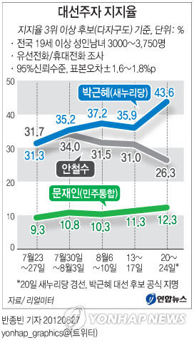 새누리당 박근혜 대선후보와 야권의 유력후보로 거론되는 안철수 서울대 융합과학기술대학원장이 대선 지지도 조사에서 접전을 벌이는 것으로 26일 나타났다.