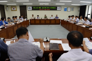 27일 제15호 태풍 볼라벤의 북상에 따라 공주시청 소회의실에서 전경일 산업국장의 주관으로 관계공무원 비상대책회의를 열고 있다.공주시는 27일 시청 소회의실에서 각 부서장들이 참석한 가운데 제15호 태풍 볼라벤 대비 대책회의를 개최하고 시민안전에 만전을 기했다.