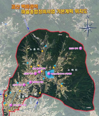 백마권역 종합정비 사업은 괴산군 사리면 중흥·소매·노송리 9개 마을에 1569ha 규모로 55억원의 사업비를 투입해 2015년까지 ‘백마산 아래 자락 도·농 교류 1번지’라는 비전을 갖고 친환경·체험·휴양·교류로 도시와 농촌 어우러지는 방향으로 전개된다.