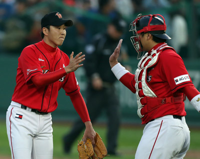| 20일 부산 사직야구장에서 열린 2012 팔도 프로야구 플레이오프 4차전 롯데와 SK의 경기. SK가 롯데를 2대1로 이긴 뒤 정우람과 조인성이 하이파이브하고 있다. |