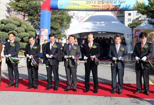 14일 대전 한밭대학교에서 열린 산학협력 박람회에서 이원묵 한밭대 총장(왼쪽 세번째부터), 염홍철 대전시장, 김신호 대전시교육감 등 참석자들이 테이프 커팅을 하고 있다.
