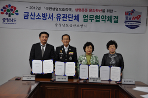 금산소방서(서장 조석구)는 지난 28일 본청 상황실에서 2012년‘국민생명보호정책’지역단위 생명문화 확산을 위한 관련기관 및 단체 상호업무협약 체결했다.