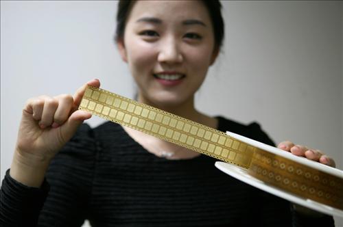 LG이노텍은 신용카드, 교통카드로 쓰이는 스마트카드에 부착돼 정보전달이나 통신기능을 담당하는 테이프타입 기판(COB) 개발에 성공해 이달 중순부터 양산을 시작한다고 6일 밝혔다. 사진은 LG이노텍 직원이 릴투릴 형식으로 생산된 스마트카드용 테이프 타입 기판을 펼쳐보고 있다.