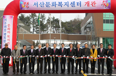 서산지경 주민들의 문화와 복지수준을 높여줄 서산문화복지센터가 개관식을 갖고 본격 운영에 들어갔다. 사진은 이완섭 서산시장가 이철수 서산시의회의장 등이 개관식 기념테이프를 커팅하는 모습. <서산/장인철>