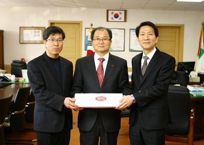 서울대 수시모집에서 2명의 서울대 합격생을 배출한 청양고가 지역교육발전을 지원한 이석화 군수를 찾아 감사의 복떡을 전하고 있다. 왼쪽부터 김경수 교무부장, 이석화 군수, 전종현 교감.<금산/길효근>