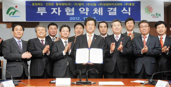 충북도는 13일 ㈜동국제약, ㈜엠지, ㈜신일, ㈜보령바이오파마, ㈜효성, ㈜에이프로젠과 투자협약을 했다.