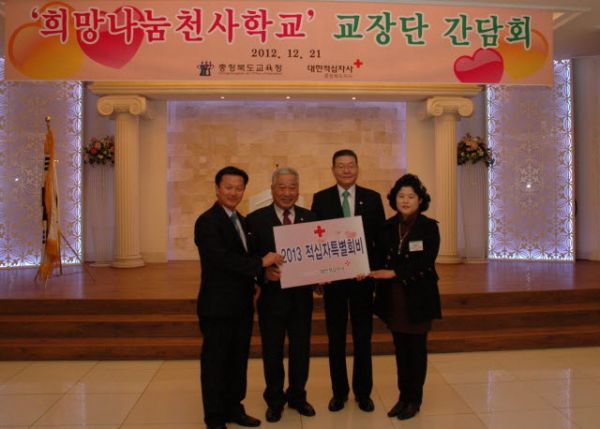 대한적십자사 충북지사(회장 성영용)는 21일 이기용 충북도 교육감, 박상필 충북도 교육위원, 충북도교육청 학교운영위원회 협의회 및 충북도내 60여명의 교장이 참석한 가운데 청주선프라자컨벤션센터에서 희망나눔 천사학교 교장단 간담회를 실시했다.