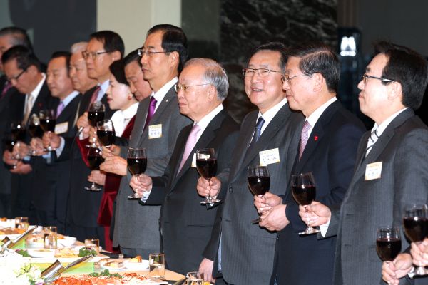 사진설명: 중소기업인 신년인사회에서 참석자들이 건배를 하고 있다. 사진은 오른쪽부터 서병수 새누리당 사무총장, 김황식 국무총리, 김기문 중소기업중앙회장, 손경식 대한상공회의소 회장, 한덕수 한국무역협회장.