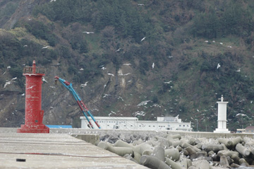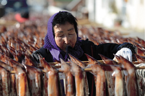 오징어는 할복 작업 후 바로 대나무에 꿰어 바닷바람에 말리는데, 대나무를 오징어 머리 중앙에 꿰는 건 울릉도의 특징. 이를 통해 다른 지역 오징어와 울릉도 오징어를 구분할 수 있다고 한다. 저동항 방파제 앞 촛대바위는 울릉도의 또 다른 일출 명소다.