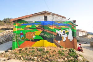 당리 입구 창고 벽에 그려진 원색의 벽화,‘서편제’의 세 주인공이 진도아리랑을 부르며 걷던 붉은 황톳길을 재현했다.