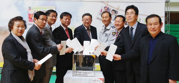 왼쪽부터 김영옥 자원봉사센터장, 박상기 지역개발회장, 이용대 농어촌공사 음성지사장, 임광혁 음성교육장, 이필용 음성군수, 윤중섭 음성경찰서장, 손수종 음성군의장, 설문식 충북도 경제부지사.
