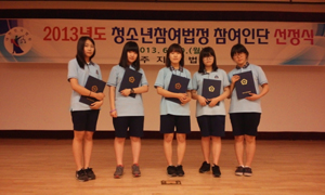 선정된 학생은 2년 김정강, 최유림·황혜임양·1년 윤소원·손한경양 등 5명으로 10일 오후 2시 청주지법에서 열린 ‘2013년도 청소년참여법정 참여인단 선정식’에 참석해 선정서를 받았다.