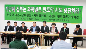 민주당은 “대전시가 엑스포과학공원에 과학벨트 거점지구 핵심시설인 기초과학연구원을 입주시키자는 정부의 제안을 수용하면 과학벨트는 빈껍데기로 전락할 것”이라고 주장했다.