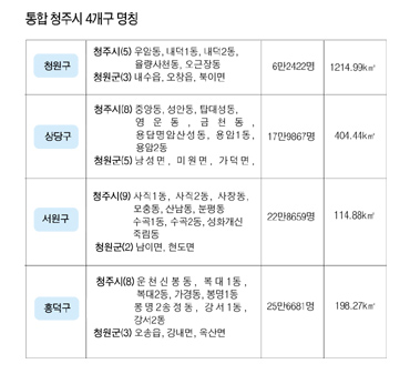 이어 5월 30일 4개 구 명칭이 △가 구역 ‘청원구’ △나 구역 ‘상당구’ △다 구역 ‘서원구’ △라 구역 ‘흥덕구’로 확정됐다.
