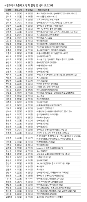 도내 250여곳의 초등학교에서는 이번 여름방학을 맞이해 학교와 지역실정에 맞는 다양한 프로그램을 마련해 운영할 계획을 세우고 있다. 특히 글로벌 시대의 실력 있는 인재 양성을 위해 100여곳의 초등학교가 방학 중 내실 있는 영어캠프 등을 마련해 학생들의 실력 향상에 힘쓴다.