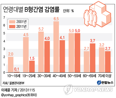 2011년 50대의 B형간염 감염률은 5.0%로 연령대 가운데 가장 높았고 30·40대가 4.0∼4.1%를 보였다. 60대와 70대 이상은 각각 3.7%와 2.7%를 기록했다.