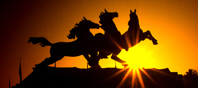 1일 오전 국립대전현충원 천마웅비상(天馬雄飛像) 사이로 2014 갑오년(甲午年) 새해를 밝히는 태양이 화려하게 빛나고 있다. 60년 만에 찾아온 '청마의 해'인 2014년에는 국민 모두가 힘차고 진취적인 청마의 기운을 받아 새롭게 도약할 수 있는 역동적인 한 해가 되기를 기원해 본다. 천마웅비상(天馬雄飛像)은 순국선열과 호국영령의 넋을 원동력으로 세필의 천마가 힘찬 기세로 조국을 영원히 약진, 번영으로 이끈다는 의미를 지니고 있다.<사진/임동빈>