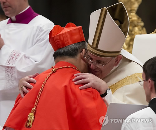 바티칸 서임 예식에서 프란치스코 교황으로부터 순교자의 피와 추기경을 상징하는 진홍색 주케토(성직자들이 쓰는 원형의 작은 모자)와 비레타(주케토 위에 쓰는 3각 모자), 추기경 반지를 수여받는 염수정 추기경