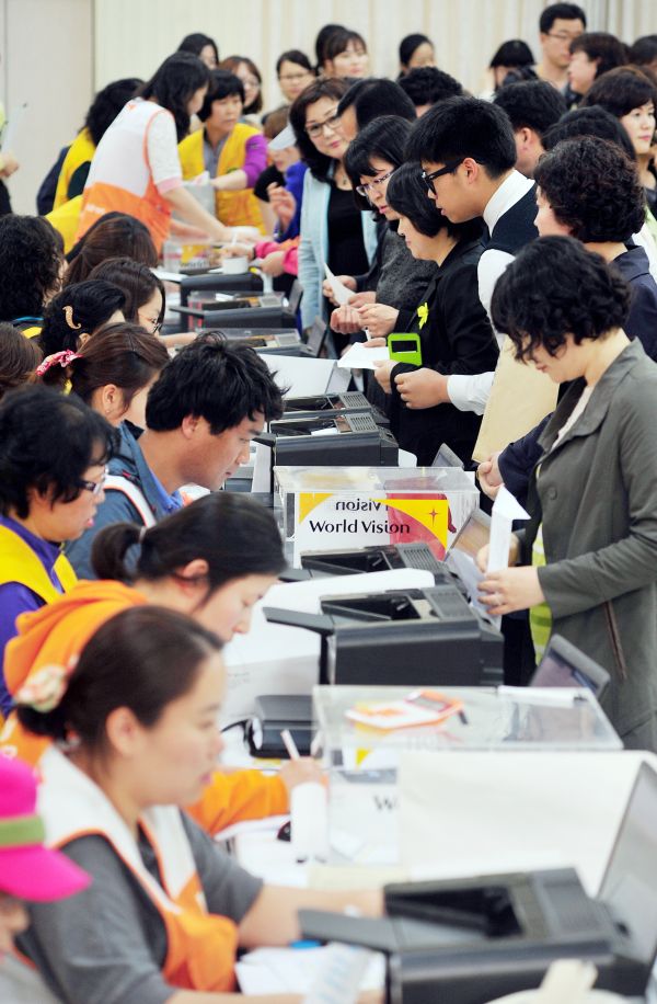 30일 청주시 흥덕구청 대회의실에서 열린 19회 '사랑의 점심나누기' 순회모금 행사에서 참여한 시민들이 줄지어 성금을 접수하고 있다. <사진/임동빈>