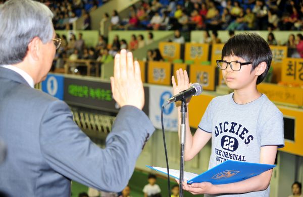 대회 첫 접수자인 청주 창신초 6학년 노정열 군이 참가학생을 대표해 '우리의 다짐'을 낭독하고 있다.