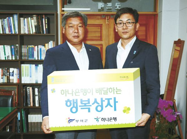 하나은행 부여지점(지점장 이광현)은 지난 29일 여름방학을 맞은 저소득층 어린이들에게 전해달라며 이용우 부여군수(왼쪽)에게 학용품 및 생필품을 담은 행복나눔 상자꾸러미 50상자를 전달했다.