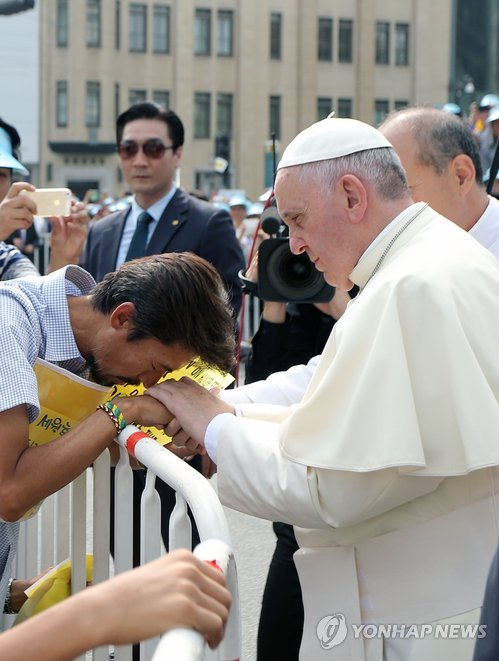 세월호 참사 희생자 유족이 프란치스코 교황에게서 '프란치스코'라는 이름으로 직접 세례를 받았17일 천주교 교황방한위원회에 따르면 프란치스코 교황은 이날 오전 7시께 궁정동 주한교황청대사관에서 세월호 참사로 숨진 단원고 학생 이승현 군의 아버지 이호진(56) 씨에게 세례를 줬다.
