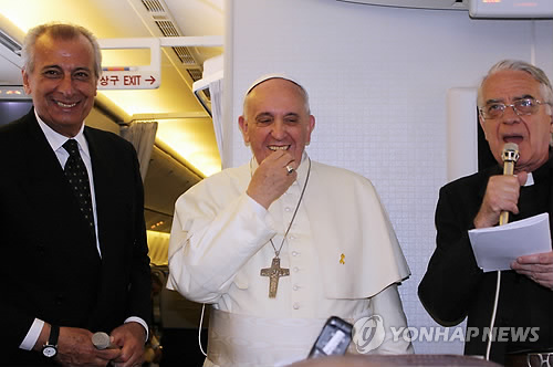 이날 교황의 방한 결산 기자회견은 한 시간 동안 이탈리아어로 진행됐다.(교황 전세기=연합뉴스)