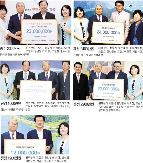 이날 행사에서는 동양일보와 CJB청주방송, 월드비전 충북지부가 지난 4월 충북도내를 순회하며 전개한 ‘19회 사랑의 점심 나누기 캠페인’을 통해 모금된 성금의 일부가 각 지역에 전달됐다. 충주시 2300만원, 제천시 2400만원, 단양군 1000만원, 음성군 2200만원, 증평군 1200만원이 각각 전달됐다.