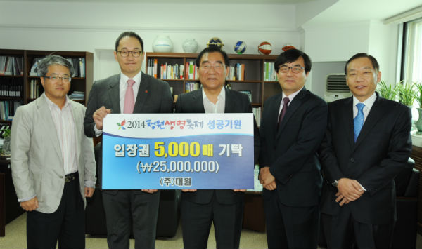 ㈜대원(대표이사 전영우) 전응식 부사장은 18일 청원생명축제 입장권 5000매(2500만원 상당)를 이승훈 청주시장에게 전달했다. 청주시는 기탁된 입장권을 지역 소외된 이웃과 저소득 가정에게 전달할 예정이다.