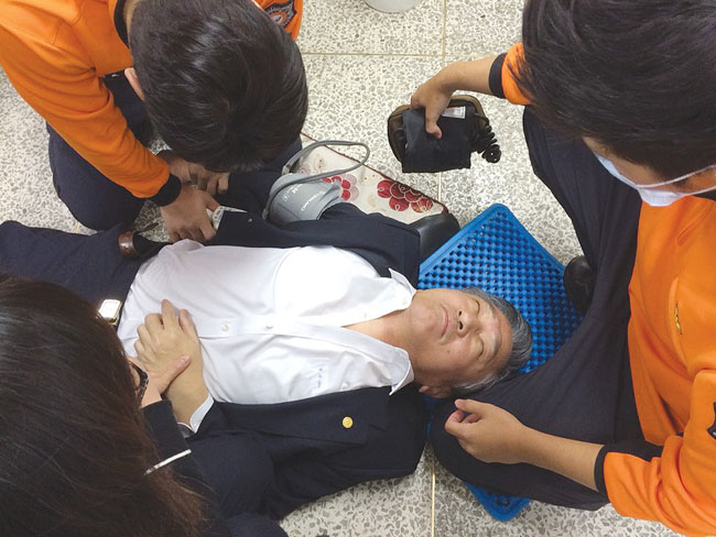 탈진한 김윤배 총장 엠뷸런스로 병원 이송