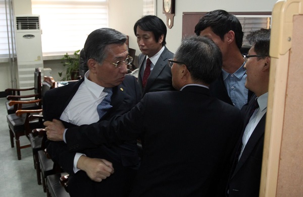 경청호 총동문회장 등은 김 총장에게 막말과 멱살잡이를 하며 사퇴를 요구했으며, 학생 100여명은 돗자리를 깔고 바닥에 앉아 2층 복도를 점령한 채 출입구를 봉쇄했다. 김 총장의 차는 학생들이 붙인 총장의 퇴진을 요구하는 문구가 쓰인 스티커로 도배됐다.