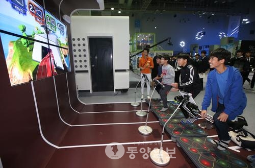 (동양일보)3일 오전 부산 벡스코에서 개막한 '대한민국 과학창의 축전'을 찾은 학생들이 IT를 건강에 접목시킨 건강관리 애플리케이션 체험을 하며 즐거워하고 있다.