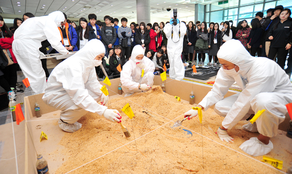 ▲ 66회 과학수사의 날을 기념해 5일 서원대 미래창조관 로비에서 열린 '경찰행정학과 학술제·C.S.I 과학수사 콘서트'에서 경찰행정학과 학생들이 충북지방경찰청 CSI-1팀과 함께 매장시체발굴기법 시연을 펼치고 있다.<사진/임동빈>