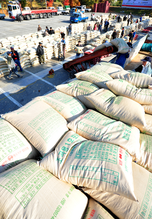 ▲ 10일 청주시 상당구 방서동 농협 충북유통센터 광장에서 2014년산 청주시 공공비축 벼수매 작업이 한창이다. 청주시의 올해 건조 벼 매입물량은 포대벼가 6만7270포, 톤백벼가 6만3156포 등 총13만426포(40kg 기준)이다.<사진/임동빈>