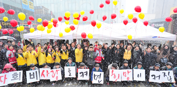 ▲ 1일 청주 성안길 철당간 광장에서 열린 '2015 적십자 회비모금 성공기원 선포식'에서 이시종 충북지사와 김병우 충북도교육감, 성영용 충북적십자사 회장 등 참석자들이 소망풍선 날리기 퍼포먼스를 펼치고 있다. '적십자회비, 사랑을 켜면 희망이 커집니다'라는 주제로 시작된 이번 모금활동은 2015년 1월 31일까지 이어진다.<사진/임동빈>