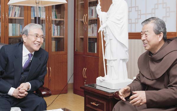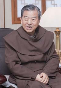짧지 않은 그 동안에 행사장에서 악수만 나눈 적이 몇 차례 있었을 뿐이었다. 그때마다 “잘 견디고 있으신가요”라고 물었었다. 그 말 속에는, 짧지 않은 기간 검찰과 일부 언론들로부터 호되게 시달리면서 거의 대외관계-특히 언론과의 소통을 차단한 채 꽃동네에 칩거하여 수도에 정진한다는 소문대로라면 퍽이나 괴롭고 외로울 것이라는 생각을 묶은 안부가 숨어 있었다. 그러다가 지난 해 말 한 ‘송년모임’ 석상에서 “이제 시간을 내서 속 얘기나 하자”면서 인터뷰 시간을 잡자고 몰아쳤다. 지난 몇 년간 만나자는 내 제의에 한결같이 ‘취재가 아닌 개인적인 만남’을 전제로 했던 터여서 성사여부는 반반이었다. 그런데 “이번에 필리핀 다녀와서 보자”며 선선히 응했다. 그로부터 한 달여 만의 만남이었다. 만나기로 한 ‘사랑의 영성원’(2005년 준공)은 꽃동네를 품고 있는 ‘소 속리산’(431m) 등성이에 있어 꽃동네에서는 제일 높은 곳에 자리해 있었다. 로비에 들어서자 오 신부는 생각도 못했던 중세시대 수도자들이 입었던 것 같은 밤색 망토에 모자가 달린 수사복장으로 나타났다.