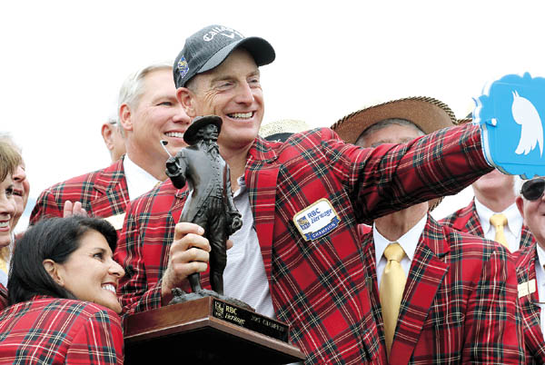 (동양일보)20일 미국 사우스캐롤라이나주 힐튼헤드의 하버타운 골프 링크스에서 열린 미국프로골프(PGA)투어 RBC헤리티지에서 우승을 차지한 짐 퓨릭이 우승컵을 들고 기뻐하고 있다.