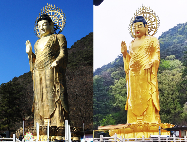 단장을 마친 불상은 누런 광채를 되찾았다. 햇볕이 반사되면 눈이 부셔 똑바로 바라보기 힘들 정도다.