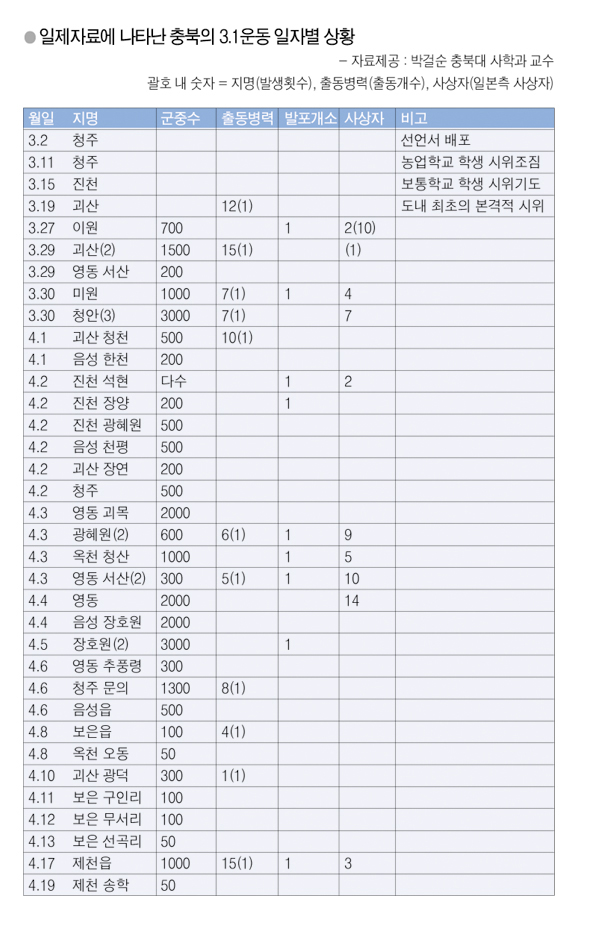 박걸순 충북대 사학과 교수가 쓴 논문에 따르면 충북에서는 최소 35회의 만세시위가 일어났음을 확인할 수 있다. 충북대 중원문화연구소 발간 ‘중원문화연구’에서 박 교수는 35회 만세시위가 일어났던 도표를 제시하며 “그러나 이 자료도 누락된 것이 많다. 우리 측 자료는 물론 일제 측 자료에서도 소규모 인원이 모여 단순히 만세를 외친 경우, 일제 군경이 출동하지 않고 시위 후 자진 해산한 경우, 경찰이나 헌병주재소와 멀리 떨어져 있어 일제가 뒤늦게 파악한 경우 등은 통계에서 제외되었다. 따라서 3.1운동 관련 통계는 우리나 일제 측 자료 모두 불완전하고 부정확한 것이다. 필자가 종합한 바에 다르면 도내 각 군에서 최소한 50회 아상의 만세시위가 발생했음이 확실하다”고 밝히고 있다.