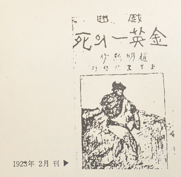 ‘戱曲, 金英一의 死, 趙明熙作, 東洋書院發行, 1923年 2月 刊’. 책 표지에 희곡의 주인공 김영일을 그려넣은 삽화가 마음속으로 짠하게 다가왔다. 표지에 그려놓은 청년은 김영일이기도 했고, 포석 자신이기도 했다. 그리고 그 청년의 모습은 가난한 문인으로서의 지난한 삶을 시작하는 포석의 첫 걸음이기도 했다.
