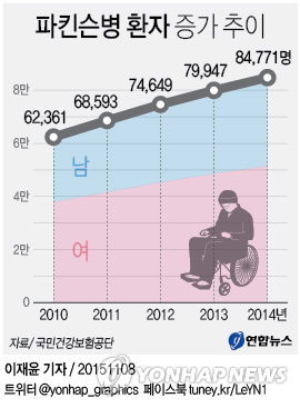 8일 국민건강보험공단의 지급 분석자료를 보면 파킨슨병(질병코드 G20) 진료인원은 2010년 6만2361명에서 2014년 8만4771명으로 35.9% 늘었다. 연평균 8.0%씩 증가했다.