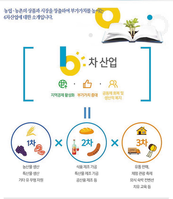 6차 산업은 기존 단순 영농(1차 산업)에서 벗어나 제조가공(2차 산업), 유통판매·체험관광(3차 산업) 등을 함께 연계해 새로운 부가가치를 창출하는 활동을 말한다. 최근 들어 6차 산업이 미래 농촌의 성장 모델로 주목받으면서 귀농·귀촌을 희망하는 베이비부머와 은퇴자들은 물론 20~40대 청장년층에게도 큰 관심을 받고 있다.