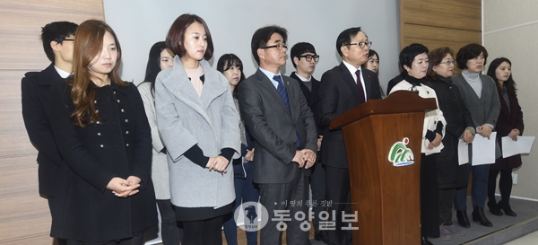 (동양일보 고경수 기자) 9일 오전 충북도청에서 충북 16개 사회복지직능단체 회원들이 어린이집 누리과정 예산편성을 촉구하는 기자회견을 갖고 있다.